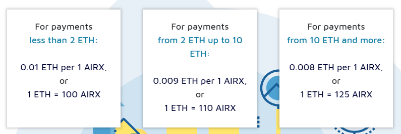 ✪ 0,009 ETH per 1 AIRX untuk pembayaran dari 2 ETH hingga 10 ETH (mis. 1 ETH = 110 AIRX) ✪