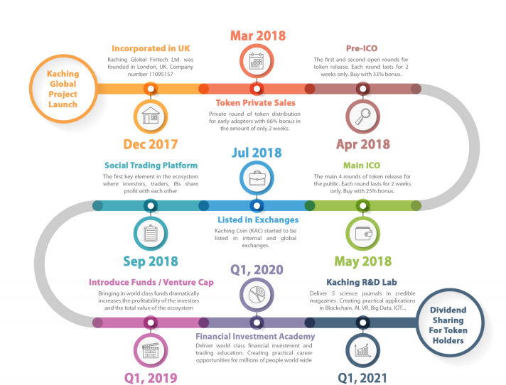 - Maggio 2018: ICO Kaching Coin (KAC) ha iniziato a essere quotata negli scambi interni e globali, facilitando il trading.