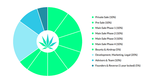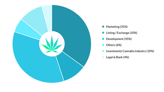 • Listing of Exchange: notering of uitwisseling is het belangrijkst voor het platform. Vanwege dit platform staat de cryptocurrency voor de token economy toe. Door het token kunnen mensen de cannabis kopen en de betaling betalen voor de aankoop. Dientengevolge moet het platform een notering of een uitwisselingsfaciliteit met de cryptocurrency uitvoeren. Fonds van 10% wordt toegewezen voor het doel van de vermelding en de uitwisseling.